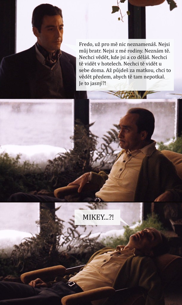 Fredo to podělal. Byl vypočítavej křivák, co zradil rodinu. Vůbec mu nedocházelo, čeho se dopustil. Jeho kříváctví bylo tak integrální součástí jeho charakteru, že to už prostě nešlo změnit. Mike tak musel učinit jisté kroky, aby ochránil zbytek rodiny. Možná je to dobré i pro Freda, protože se díky tomu třeba zastydí a uvědomí si svůj prašivej stav. Ve skutečnosti Mike takovéhle ohledy na Freda ale už dávno nebere….nehodlá trávit ani minutu svého drahocenného času úvahami o tom, co by mohlo Fredovi pomoci. Proč taky? Jde mu o odškodnění a ochranu nevinných obětí… přičemž každý ví, že hlavní obětí je stejně Mike sám.
