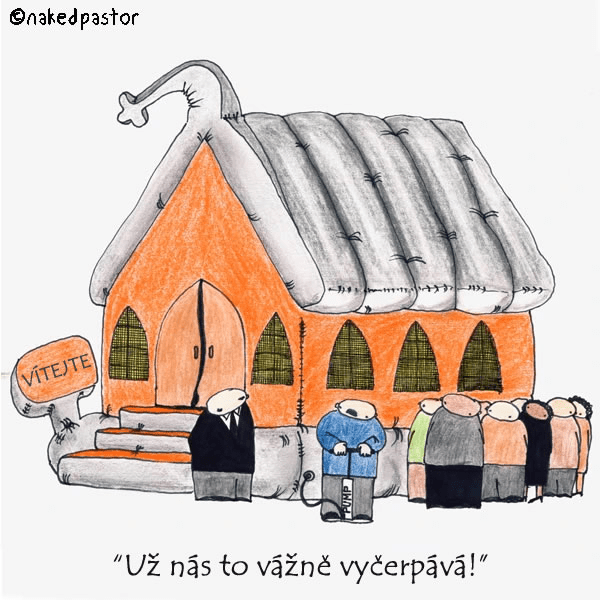 Tento zážitek mi připomněl církev. I ona je jako ten nafukovací hrad – neustále do ní musíme pumpovat čas, energii, peníze a další zdroje, aby si udržela svůj tvar a mohlo se uvnitř poskakovat. Je to vyčerpávající práce, jejímž hlavním cílem je, aby se lidé uvnitř cítili dobře a byli šťastní. Ale co se stane, když toto úsilí ustane? Církev, stejně jako ten hrad, splaskne.