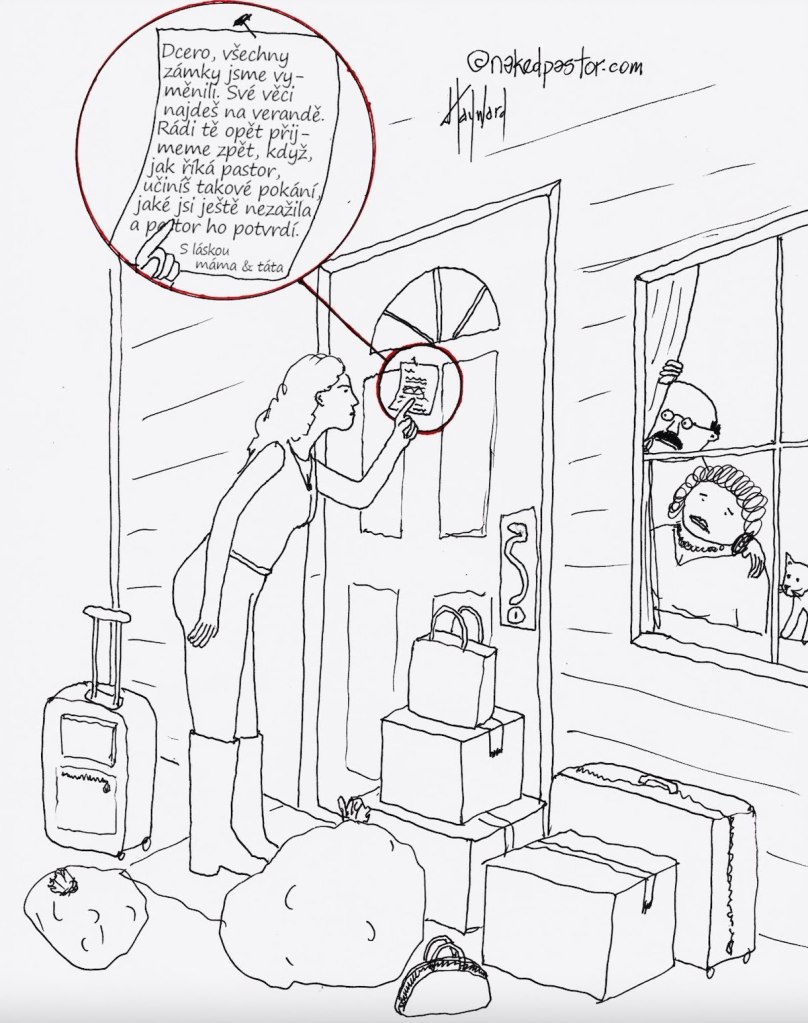 Dcero, všechny zámky jsme vyměnili. Své věci najdeš na verandě. Rádi tě opět přijmeme zpět, když, jak říká pastor, učiníš takové pokání, jaké jsi ještě nezažila a pastor ho potvrdí. S láskou máma & táta.