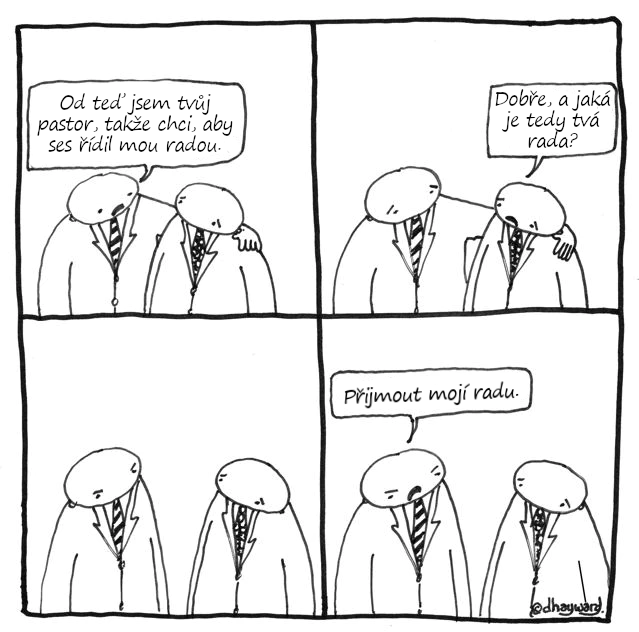 Když vám řeknou: „Tohle je moje rada“, obvykle tím myslí: „Tohle je můj rozkaz!“ Ono není vhodné dávat rozkazy, proto se to prezentuje jako rada. Radu však můžete přijmout, nebo odmítnout. Rozkaz nikoliv. Takže velmi rychle zjistíte, že radu, kterou dostanete, nemůžete jen tak nechat být. Pokud ji nepřijmete, přijde výprask. Vedoucí prostě nesnesou, když jejich rady nepřijímáte. Jsou totiž přesvědčeni, že jejich rady nejsou jen dobrým návrhem, ale jsou i jedinou správnou věcí. A pokud neuděláte onu správnou věc, tak děláte něco špatně. Jdete proti nim, proti jejich doporučení, proti jejich moudrosti, proti jejich přání a v neposlední řadě, proti jejich autoritě. Když vám tedy pastor nebo vedoucí dává radu, je to ve skutečnosti rozkaz. Pamatujte si to.